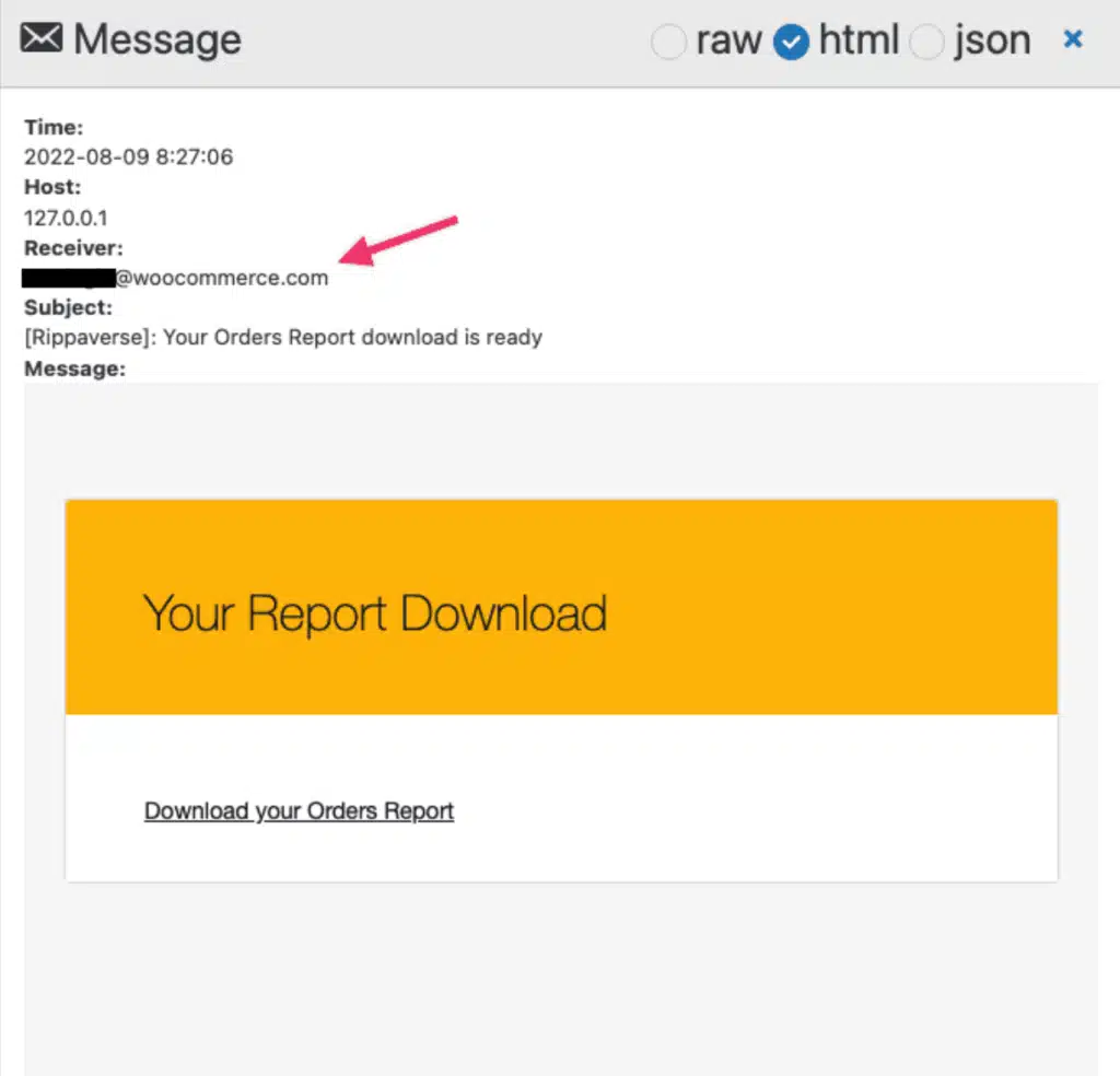 אם הטווח התאריכים שנבחר גורם לנתונים להתרחש על מספר דפים בטבלה, תהליך ההורדה של קובץ ה-CSV יתבצע כמשימה רקעית על ידי WooCommerce. לאחר שהנתונים מוכנים להורדה, יישלח אימייל לכתובת המקושרת לחשבון ה-WordPress שלך עם קישור להורדת הקובץ. כך תיראה הודעת האימייל